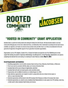 The Jacobsen Seed “Rooted in Community Grant” was created to support those who are working to advance ag education in their area. Organizations such as FFA chapters, County 4-H pro-grams or County Fair Boards can apply for a grant to support learning and growth in Agronomy, Biotechnology, Crop Management or Crop Physiology. Four (4) annual grants in the amount of $500 each are available. To apply, please fill out the application form below and submit no later than May 31, 2023, for consideration.